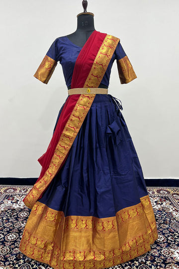 The Latest Traditional half saree collection with price for Girls That Comes With Kanjiveram Silk Zari Work Lehenga With Blouse Along With Banarasi Silk Dupatta.