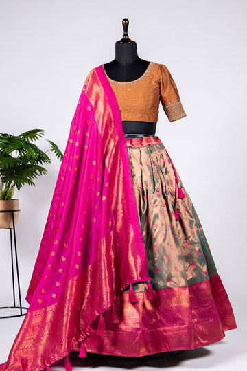 Latest Traditional Half Saree Designs New Model For Wedding That Comes With Jacquard Weaving Silk Fabric With Drawstring With Zip And Tassels.
