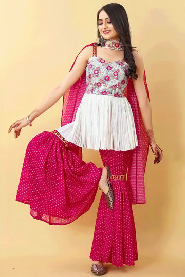 Introducing our exquisite Rani Pink Bandhani Print Sleeveless Sharara Suit, designed exclusively for girls who love to make a style statement! This stunning ensemble combines traditional charm with contemporary flair, perfect for special occasions and celebrations.