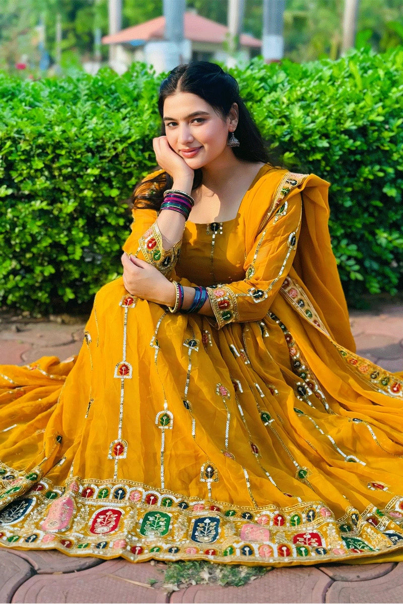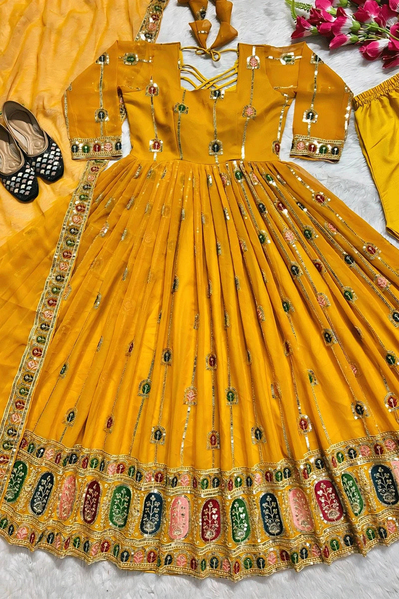 Sequence And Embroidery Work Traditional Yellow Anarkali Dress With Heavy Flare For Wedding