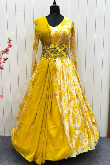 New Arrival Traditional Yellow Gown For Haldi Ceremony That Comes With Pure Soft Chiffon Fabric With Fully Digital Print And Bottom Plain Chudidar Pant.