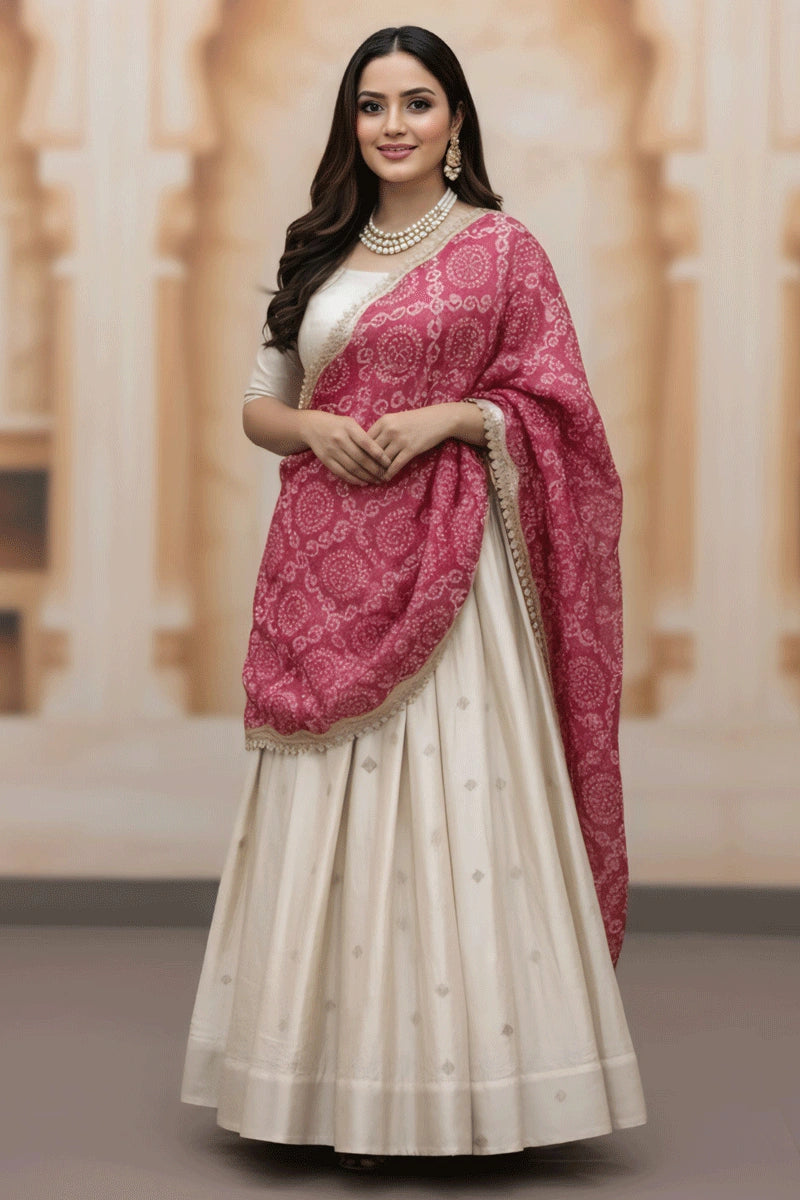 Dupatta: Pure Vichitra Original Bandhani Print Dupatta with Embroidery Border and Allover Lace Work